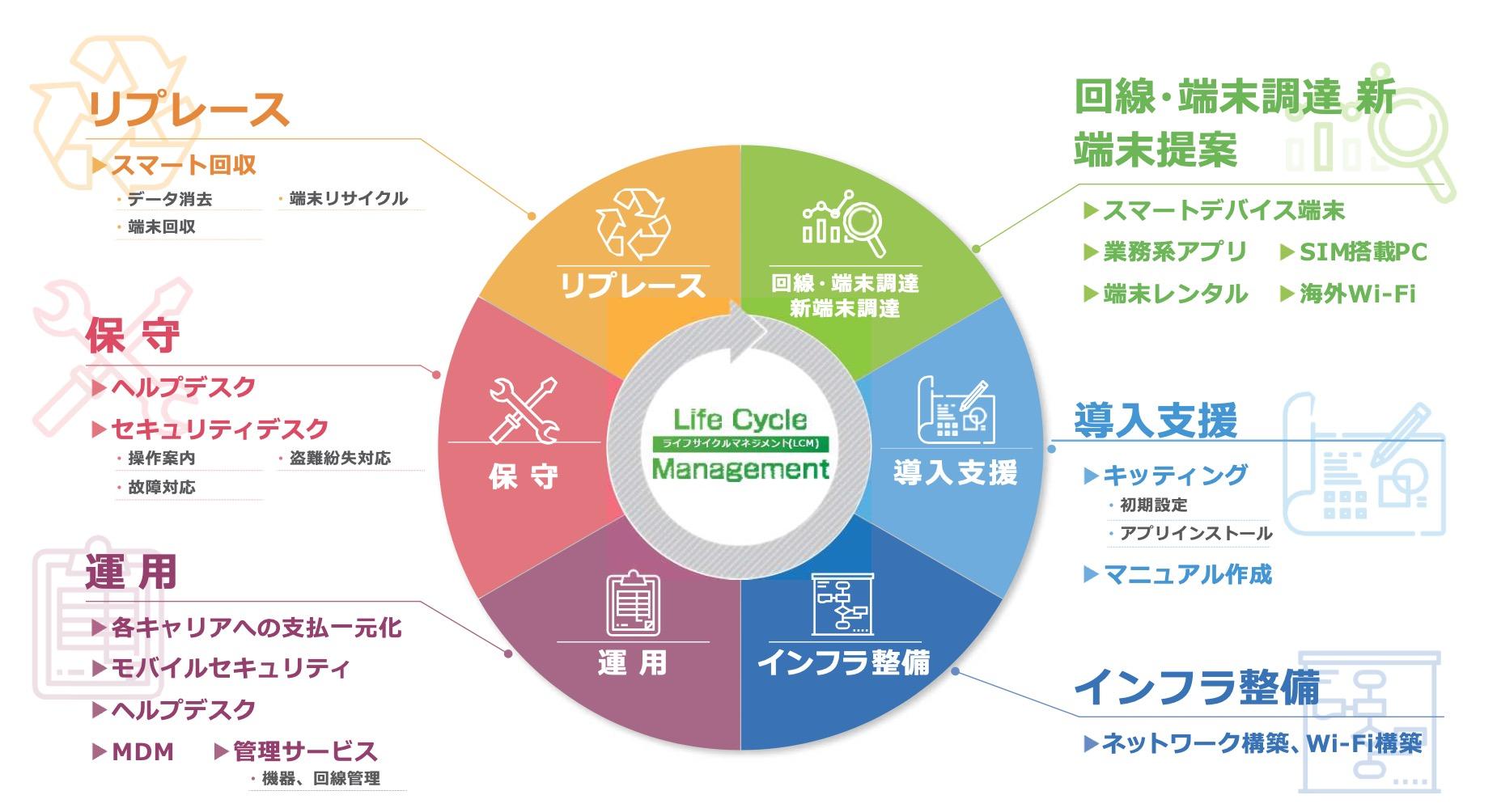 スマートフォンやタブレットといったスマートデバイスの急速な普及と、企業のICT化に伴い、それらデバイスの適切な運⽤管理が企業にとって⼤きな課題となっています。そこでティーガイアでは、顧客ニーズや企業内環境に合わせたLCM(Life Cycle Management)によるワンストップ・ソリューションを提供しています。